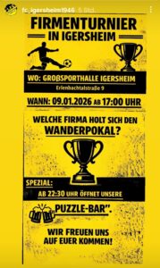 « Alle Veranstaltungen Fussball Firmenturnier Januar 9, 2026 @ 17:00 « Dreikönigslauf Schwäbisch Hall Hallensportfest Lauda » Zum Kalender hinzufügen Google Kalender iCalendar Outlook 365 Outlook Live Details Datum: Januar 9, 2026 Zeit: 17:00 Veranstaltungskategorien: Allgemein, Fußball